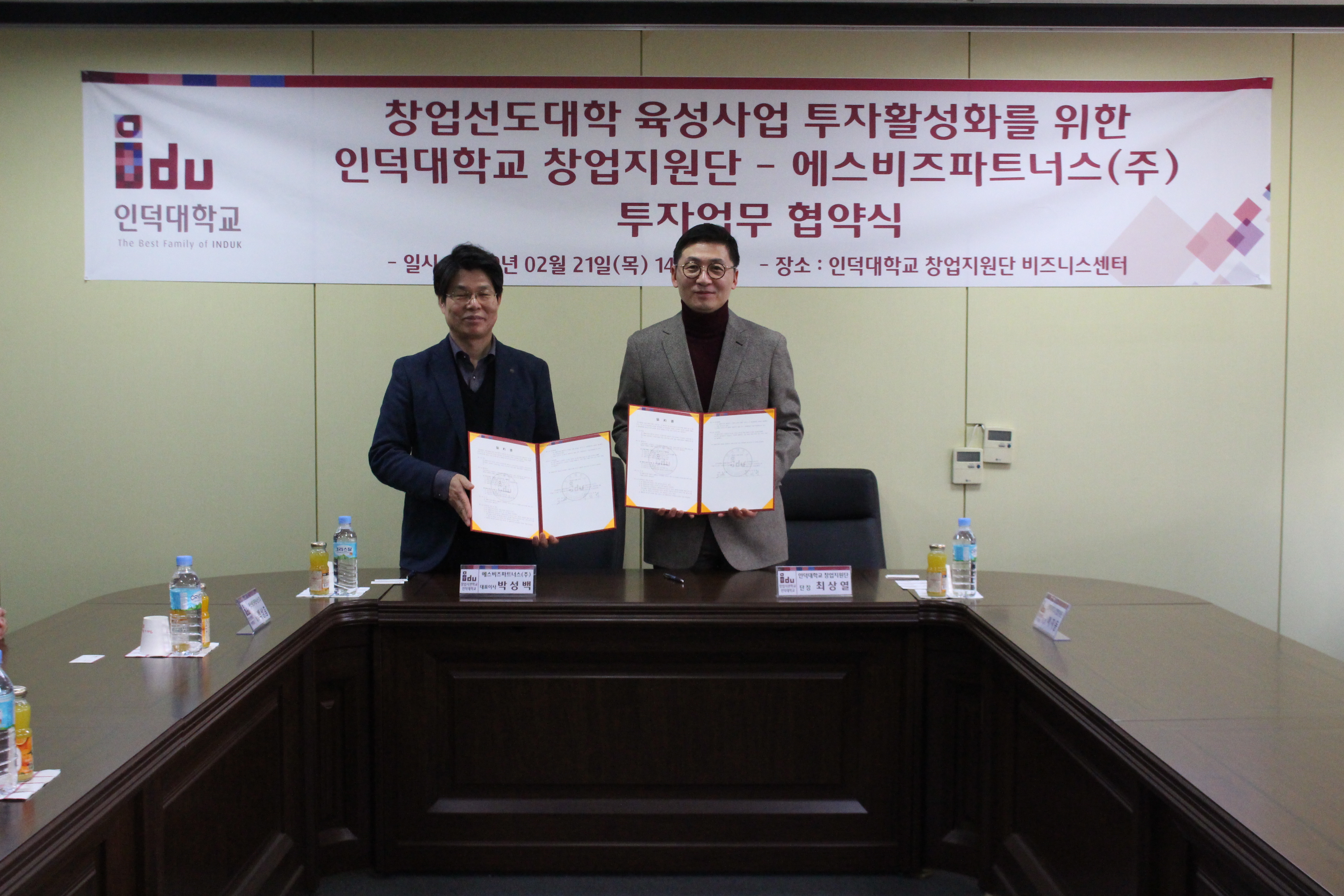 인덕대학교 창업지원단(단장 최상열)은 제1공학관 비즈니스센터에서 에스비즈파트너스(주)와 ‘인덕대학교 창업선도대학의 투자환경 저변확대와 창업활성화를 위한 MOU 및 투자의향서’를 체결했습니다.